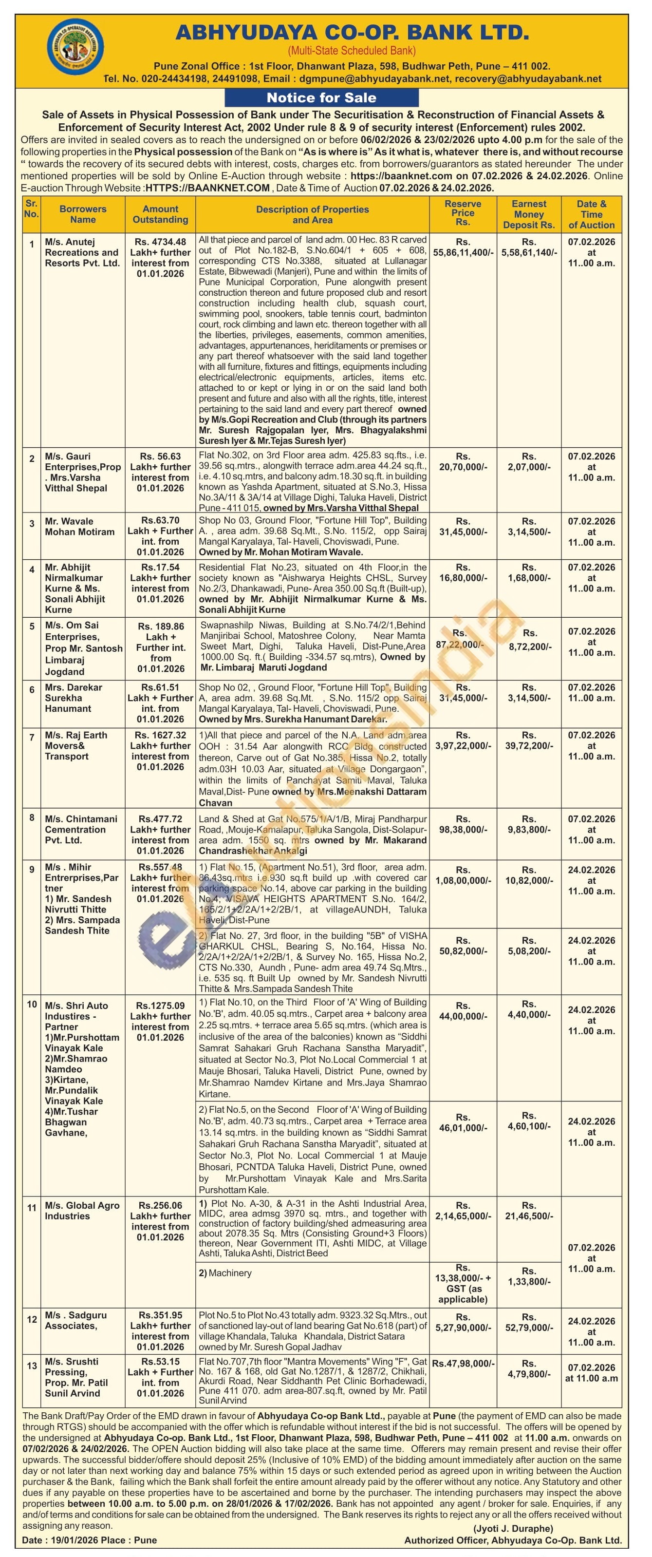 Contact Tel. No. 020-24434198, 24491098, Email: dgmpune@abhyudayabank.net, recovery@abhyudayabank.net