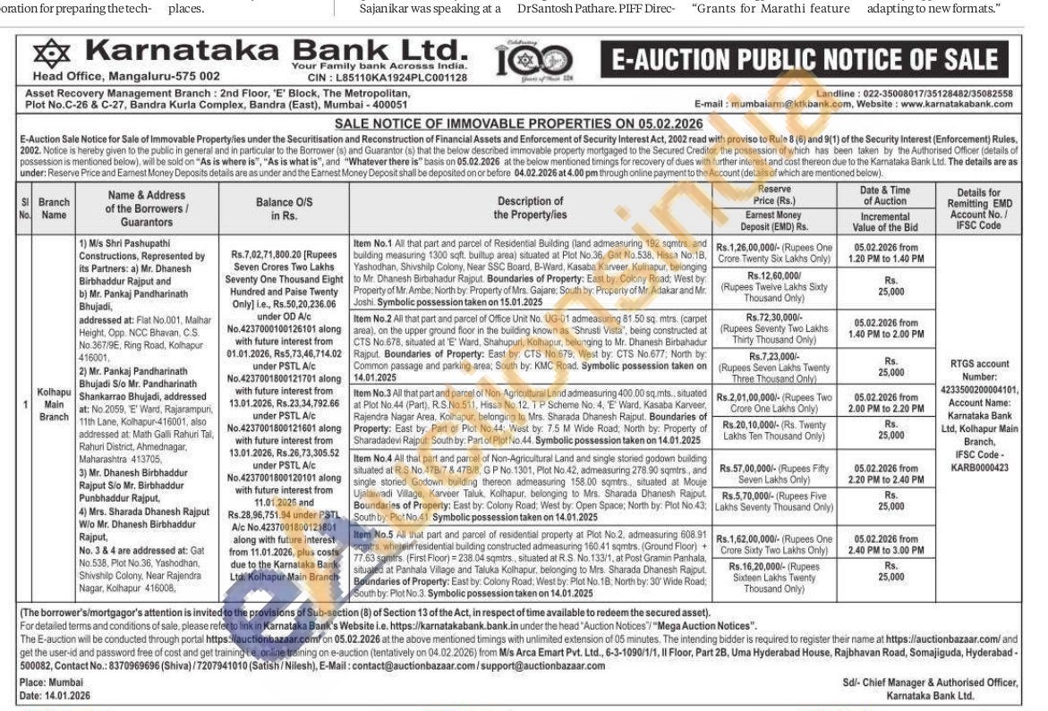 Item No.2 All that part and parcel of Office Unit No. UG-01 admeasuring 81.50 sq mirs (carpet area), on the upper ground floor in the building known as "Shrusti Vista, being constructed at CTS No 678, situated at E Ward. Shahupuri, Kolhapur, belonging to Mr. Dhanesh Birbahadur Rajput. Boundaries of Property: East by: CTS No: 679, West by: CTS No. 677: North by: Common passage and parking area, South by: KMC Road. Symbolic possession taken on 14.01.2025