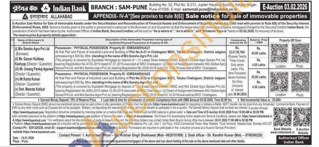 All that Part and Parcel of Industrial Land and Building of Plot No.A-22 in Chalisgaon MIDC, Taluka Chalisgaon, District Jalgaon admeasuring 4,500 Sq. Mtrs standing in the name of M/s Sanshu Agro Pvt. Ltd.