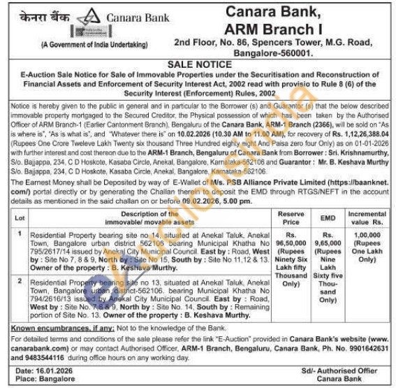Residential Property bearing site no 14, situated at Anekal Taluk, Anekal Town, Bangalore urban district 562106 bearing Municipal Khatha No 795/2617/14 issued by Anekal City Municipal Council. East by: Road, West by: Site No 7.88 9, North by: Site No 15, South by: Site No 11.12 & 13. Owner of the property: B. Keshava Murthy