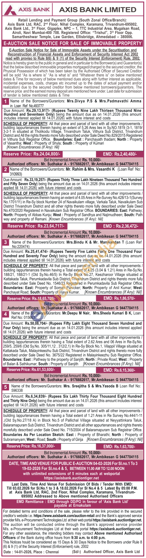 SCHEDULE OF PROPERTY: All that piece and parcel of land with all other improvements / building/appurtenances therein having a Total extent of 2.62 Ares and 06 Ares in Re-Sy.No. 259/5, 259/6 (Old Sy.No. 305/11,12, 312/2,1) In Re-Sy Block No.1, Vilappil Village situated at Kattakada Taluk, Malayinkeezhu Sub District, Trivandrum District and rights thereto more fully described under Sale Deed No. 3675/22 Registered in Malayinkeezhu Sub Registrar Office. Boundaries: East: Pathway to the property of Sanjith; North: Private Road; West: Property of Balan & Sathikumar; South: Property of Sanjith [Known Encumbrances (If Any): Nil]