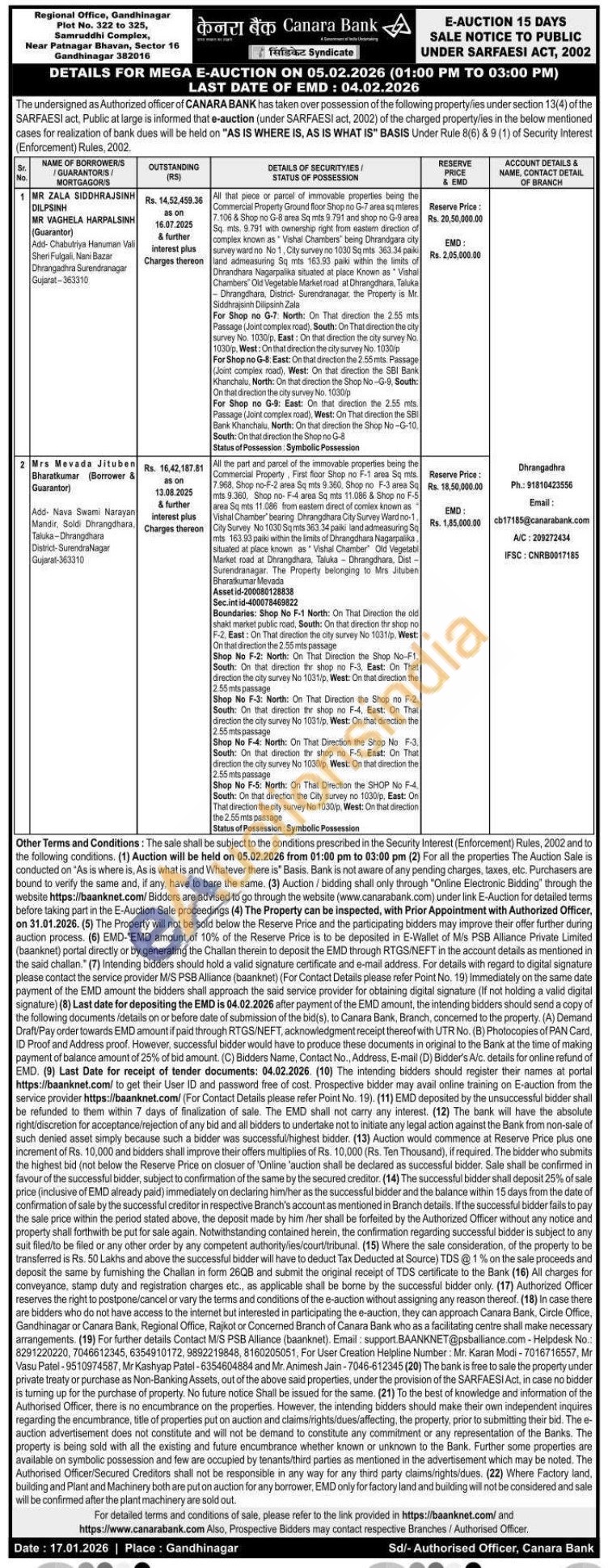All that piece or parcel of immovable properties being the Commercial Property Ground floor Shop no G-7 area sq mieres 7.106 & Shop no G-8 area Sq mls 9.791 and shop no G-9 area Sq. mts. 9.791 with ownership right from eastem direction of complex known as "Vishal Chambers" being Dhrandgara city survey ward no No 1, Cily survey no 1030 Sq mts 363.34 paik land admeasuring Sq mts 163.93 paiki within the limits of Dhrandhara Nagarpalika situated at place Known as "Vishal Chambers Old Vegetable Market road at Dhrangdhara, Taluka -Dhrangdhara, District-Surendranagar, the Property is Mr. Siddhrajsinh Dilipsinh Zala