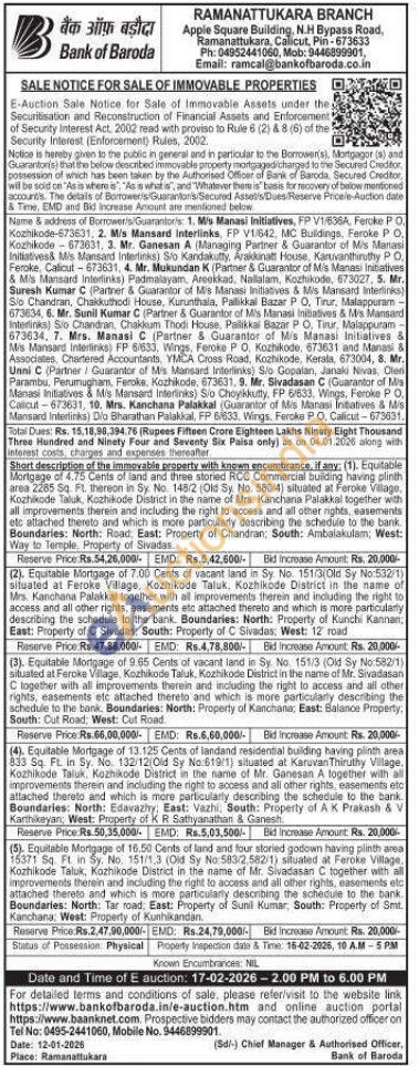 Short description of the immovable property with known encumbrance, if any: (4). Equitable Mortgage of 13.125 Cents of landand residential building having plinth area 833 Sq. Ft. in Sy. No. 132/12(Old Sy No:619/1) situated at Karuvan Thiruthy Village. Kozhikode Taluk, Kozhikode District in the name of Mr. Ganesan A together with all improvements therein and including the right to access and all other rights, easements etc attached thereto and which is more particularly describing the schedule to the bank. Boundaries: North: Edavazhy, East: Vazhi, South: Property of AK Prakash & V Karthikeyan, West: Property of KR Sathyanathan & Ganesh