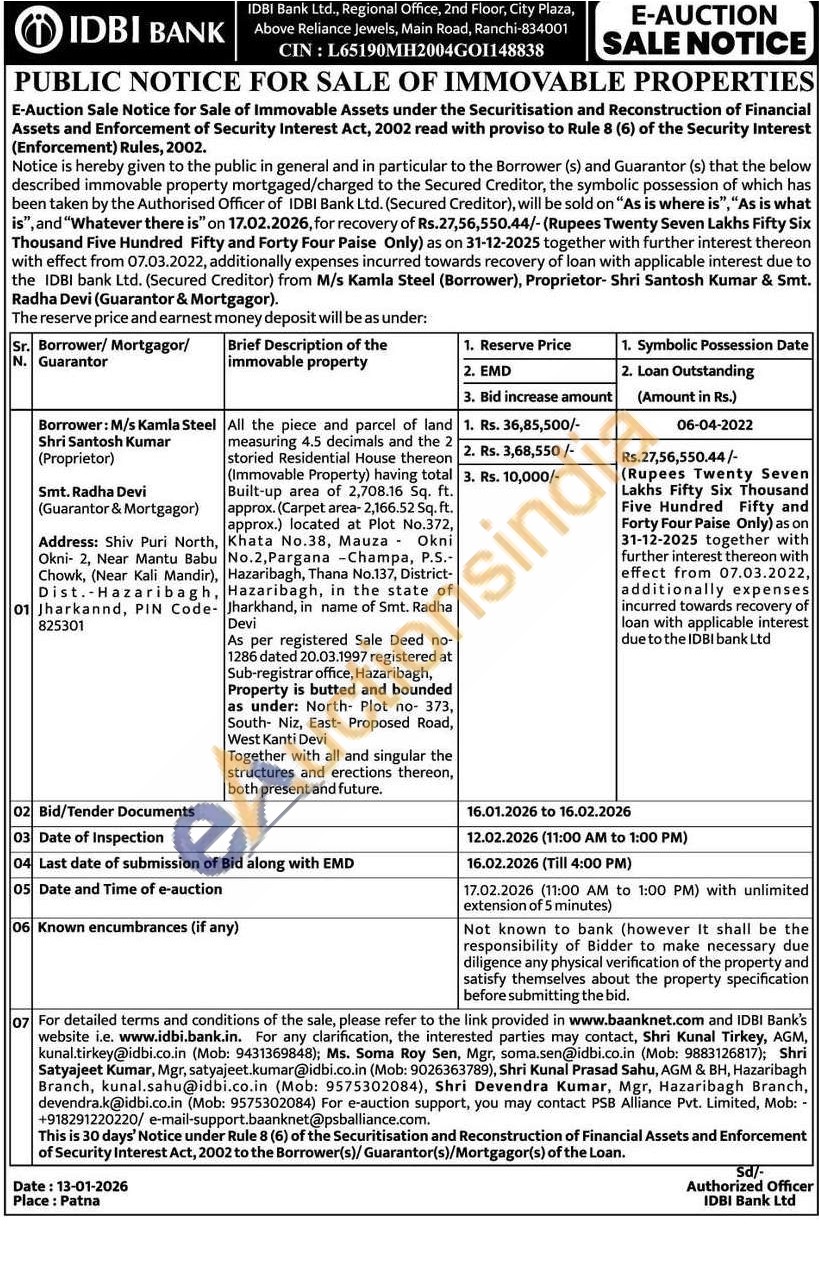 All the piece and parcel of land measuring 4.5 decimals and the 2 storied Residential House thereon (Immovable Property) having total Built-up area of 2,708.16 Sq. ft. approx. (Carpet area-2,166.52 Sq. ft. approx.) located at Plot No.372, Khata No.38, Mauza Okni No.2, Pargana-Champa, P.S.-Hazaribagh, Thana No.137, District-Hazaribagh, in the state of Jharkhand, in name of Smt. Radha Devi