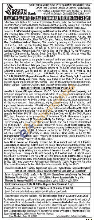 Name of Property Owner: Mr. C.A. Ashraf, Description of property: All that piece and parcel of land having a total extent of 50 cents with building situated therein comprising of 18.50 cents in Re Sy No. 248/18 pt, 1½ cents in Re Sy No. 253/6pt, 29.50 cents in Re Sy No. 248/1pt, 0.50 cents in Re Sy No. 253/6pt along with all the constructions, improvements, rights, easementary rights existing and appurtenant thereon situated in Thekkil Village, Kasargode Taluk, Uduma Sub District, Kasargode District owned by Mr. Ashraf C.A, more described in Sale Deed No. 1638 of 2004, Uduma SRO & Sale Deed No. 2851 of 2002, Uduma SRO. BOUNDARIES (18.50 cents in Re Sy No. 248/18): North: Item No.2 of Sale Deed No. 1638 of 2004, Uduma SRO, East: Property in the possession of Semeena, South: Government property West: Property of Ashraf. (1.50 cents in Re Sy No. 253/6pt): North: Panchayat Road, East: Property in the possession of Semeena, South: Item No. 1 property of Sale Deed No. 1638 of 2004, Uduma SRO), West: Property of Ashraf. (29.50 cents in Re Sy No. 248/1pt): North: Footpath situated in government property and Property in Re Sy No. 253/6, East: Property of Abdul Rahiman in Re Sy No. 253/5, South: Property of Industrial estate, West: Property of Abdul Rahiman. (0.50 cents in Re Sy No. 253/6pt): North: Footpath, East: Property of Abdul Rahiman, South: Property in Re Sy No. 248/1, West: Property in Re Sy No. 248/1.