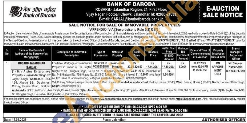Equitable Mortgage of Residential Property in favour of Sh. Jagtar Singh Sio Sh. Shingara Singh, House No. 76 B, bearing Khewat No. 748 Khatauni No. 759 Khasra No. 233(4-2) Tadadi 1/41 Share i.e. 0-2 Biswa of land measuring 04 Bighas situated at Gali No. 6 Virk Colony, Village Rasulpur Saida Tehsil & Distt. Patiala. Bounded as under:- East: Buildup House (18'-4"); West: Buildup House (60-0"); North: House of Bikar Singh South: Open Plot (49-0")