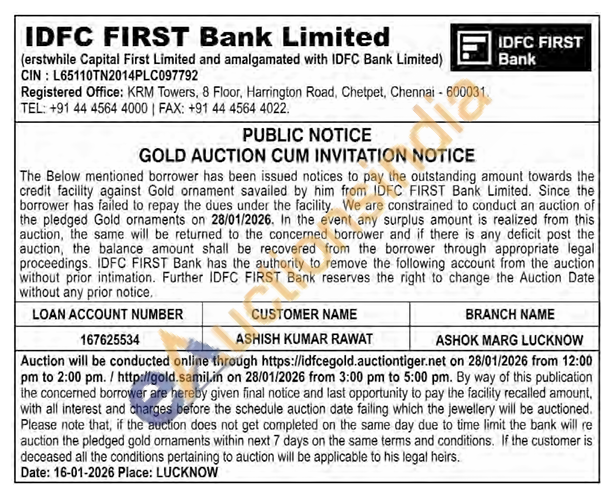 IDFC First Bank Ltd Gold Auctions Auction in Lucknow