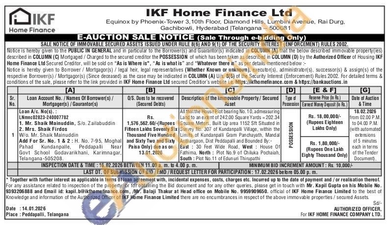 All that the House Plot bearing No. 10, admeasuring Land to an extent of 242.00 Square Yards = 202.34 Square Meters, Built Up area 1152 Sft Situated in Survey No. 307 of Kundanpalli Village, within the Limits of Kundanpalli Gram Panchayath, Mandal Anthargaon, Dist Peddapalli and Bounded By:- East: 30 Feet Wide Road, West House Of Fathima, North Plot No.9 of Chiluka Pochaiah, South: Plot No.11 of Edunuri Thirupathi