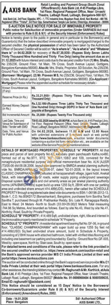 DETAILS OF MORTGAGED PROPERTIES: SCHEDULE "A" PROPERTY: All that piece and parcel of land property No.42, kallubalu gram panchayath Katha,no480, formed out of sy No.97/1, 97/2, 107, 108/1,108/2 and 109, convered for the nonagriculyure residential purpose vide official memorandum bear No. ALN (AJ)SR /73/05-06 did:09.08.2006, layout plan approved by BMRDA anekal planning authority vide No. BMRDA/APA/LAO/ 44/2006-07, dated 02-01-2008, in the layout knows CLASSIC CHAMPAKADHAMA" situated at harappanahalli village, jigani hobli, Anekal Taluk, with internal network of roads, water supply piping underground sewerage Disposal system, with parks and civil amenity areas as per anekal planning authority norms (APA/BMRDA nors) super build up area 1255 Sq ft, 2BHK with one car parking area and undivided share amount 414.489(UDS), herein after called the SCHEDULE PROPERTY through a registered sale deed vide documents no BSK-1-06196-2012-13. Book-1, C.D. No.BSKD172 (Banashankari), Bangalore, purchases form Savitha. Tand Savitha T. purchased through M. Prabhankar Reddy, Sio. Late R. Ranagappa Reddy. East to West: 24 Meters -North to South (33.00+29.08)/2 Meters Total measuring 744.96 Sq Metres, And bounded as follows. East by site No.43, West by site No.41, North by: Road, South by: Private Property.