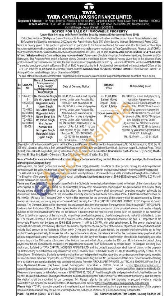 Description of the Immovable Property All that Piece and Parcels of the Residential Property bearing No. 36. Adnessuing 1250 Sq. Ft. (25x507), Situated at Maharaja Shn Ummaid Mils Karamchari Grah Nirman Sahkan Samill Lid, Subhash Nagar B. Jodhpur Road, Tehsil &Dist. Pal-306401 (Rajasthan), along with all amenties as mentioned in Sale Deed. Bounded as: East-Pict No: 37 (Side 50% West-Plot No. 35 (Side 50), North-Other Land (Side 25), South-Road 30 Wide (Side 25)
