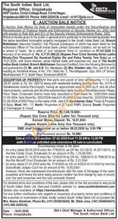DESCRIPTION OF PROPERTY All that parts and parcel of land admeasuring 11.73 ares (28.97 cents) in Sy. No. 288/1A along with residential building bearing Door No. X/119 of Vadakkekara Grama Panchayath, having an approximate area of 3400 sq.ft and all other improvements, usufructs and all other easementary rights therein of Moothakunnam Village, Parur Taluk, Emakulam District more fully described in Sale Deed No. 3200/2004 dated 21-05-2004, Sale Deed No. 3202/2004 dated 21-05-2004 & Sale Deed No. 3203/2004 dated 21-05-2004 of SRO Parur in the name of Mr. Jain K N. Boundaries: East: Thodu & Property of Baby: West: NH-17; North: Properties of St. Louis EMPL School, South: Properties of Chinnappan & Vinod