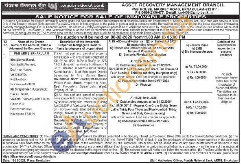 1) All that part and parcel of property consisting of 4.05 ares of land comprised in Old Sy No. 8611, 86/2A in Re.Sy. по 376/16-2-2 along with residential building no 14/337/E situated at Mazhuvannur Village, Kunnathunadu Taluk. Emakulam District belonging to Mrs Mariya Beevi Boundaries: North: Panchayath Road and Privalo Road, South: Properly of Basi East: Property of Susan John, West: Property of Babu
