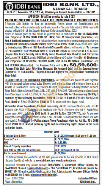 Smt.APARNA R, Authorised Officer (Mobile No : 9444960606) / Shri. SATHISH VALIPE, Branch Head (Mobile No : 9894271514) / Smt. A. Jeyalakshmi, Recovery Officer (Mobile No : 9600806410)