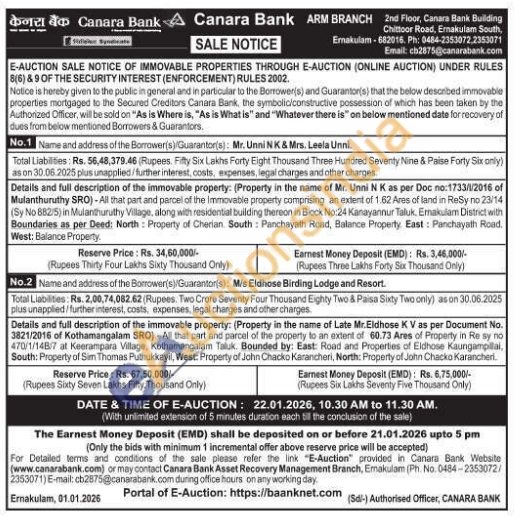 Details and full description of the immovable property: (Property in the name of Mr. Unni N K as per Doc no:1733/1/2016 of Mulanthuruthy SRO)-All that part and parcel of the Immovable property comprising an extent of 1.62 Ares of land in ReSy no 23/14 (Sy No 882/5) in Mulanthuruthy Village, along with residential building thereon in Block No:24 Kanayannur Taluk, Ernakulam District with Boundaries as per Deed: North Property of Cherian. South: Panchayath Road, Balance Property East: Panchayath Road. West: Balance Property