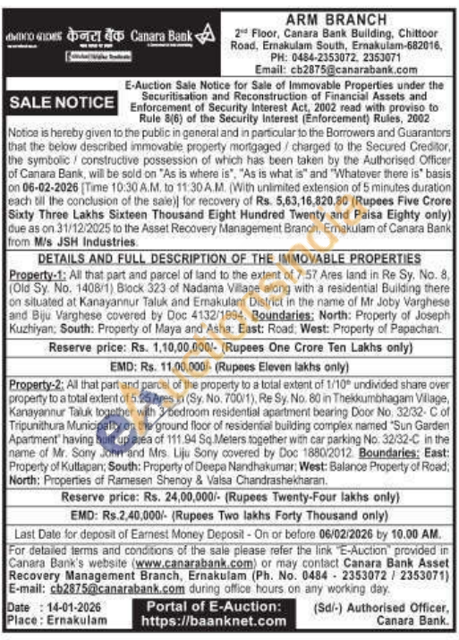 Details and full description of the immovable property: Property-2: All that part and parcel of the property to a total extent of 1/10 undivided share over property to a total extent of 5.25 Ares in (Sy. No. 700/1), Re Sy. No. 80 in Thekkumbhagam Village, Kanayannur Taluk together with 3 bedroom residential apartment bearing Door No, 32/32-C of Tripunithura Municipality on the ground floor of residential building complex named "Sun Garden Apartment having built up area of 111.94 Sq.Meters together with car parking No. 32/32-C in the name of Mr. Sony John and Mrs. Liju Sony covered by Doc 1880/2012 Boundaries: East: Property of Kuttapan; South: Property of Deepa Nandhakumar, West: Balance Property of Road; North: Properties of Ramesen Shenoy & Valsa Chandrashekharan