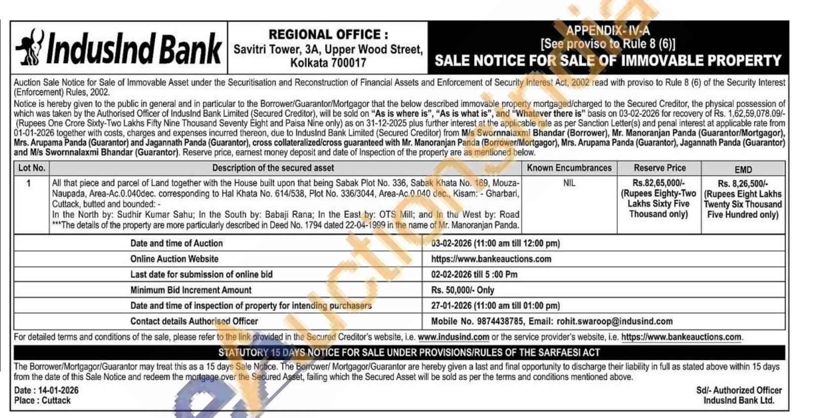 All that piece and parcel of Land together with the House built upon that being Sabak Plot No. 336, Sabak Khata No. 169, Mouza-Naupada, Area-Ac.0.040dec. corresponding to Hal Khata No. 614/538, Plot No. 336/3044, Area-Ac.0.040 dec., Kisam: Gharbari, Cuttack, butted and bounded:-