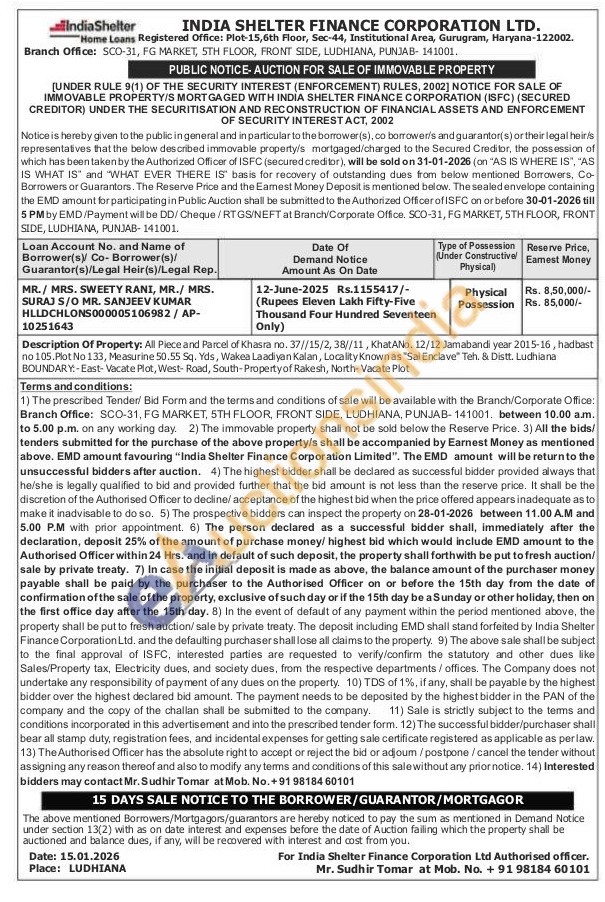 Description Of Property: All Piece and Parcel of Khasra no. 37//15/2, 38//11, Khat ANo. 12/12 Jamabandi year 2015-16, hadbast no 105. Plot No 133, Measurine 50.55 Sq. Yds, Wakea Laadiyan Kalan, Locality Known as "Sai Enclave" Teh. & Distt. Ludhiana BOUNDARY-East- Vacate Plot, West-Road, South-Property of Rakesh, North- Vacate Plot