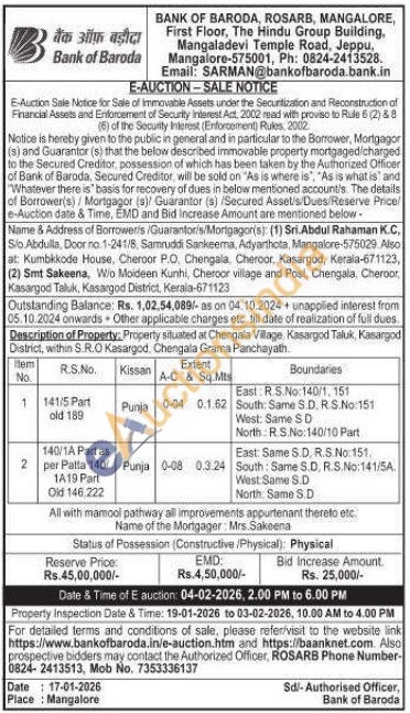 Description of Property: Property situated at Chengala Village, Kasargod Taluk, Kasargod District, within S.R.O Kasargod, Chengala Grama Panchayath