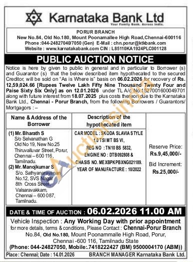 CAR MODEL: SKODA SLAVIA STYLE 1.0 TSI MT BS VI, REG NO: TN 10 BS 5832, ENGINE NO: DTB092808 & CHASIS NO. ME XBPKPBXNG021189. YEAR OF MANUFACTURE: 10/2022