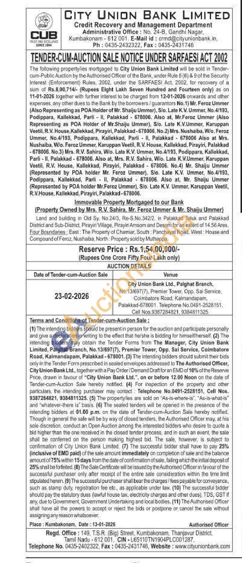 Land and building in Old Sy. No.24/3, Re-S.No.342/2, in Palakkad Talık and Palakkad District and Sub-District Pirayiri Village, Pirayiri Amsom and Desom for an extent of 14.56 Ares. Four Boundanes, East: The Property of Charniar, South: Panchayat Road, West: House and Compound of Feroz, Nushaiba, North: Property sold by Muthiappa