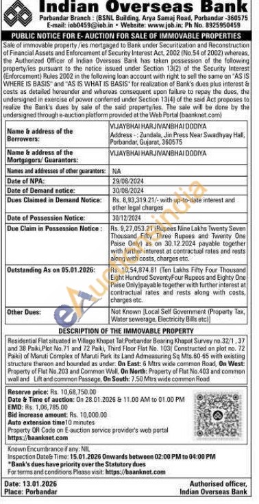 Residential Flat situated in Village Khapat Tal:Porbandar Bearing Khapat Survey no.32/1.37 and 38 Paiki, Plot No.71 and 72 Paiki, Third Floor Flat No. 1031 Constructed on plot no. 72 Paikil of Maruti Complex of Maruti Park its Land Admeasuring Sq Mts. 50-55 with existing structure thereon and bounded as under: On East: 5 Mtrs wide common Roard. On West: Property of Flat No. 203 and Common Wall, On North: Property of Flat No.403 and common wall and Lift and common Passage, On South: 7,50 Mers wide common Road