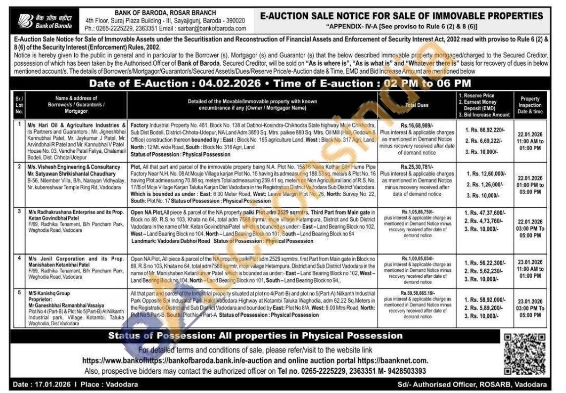 Factory Industrial Property No. 461, Block No. 138 at Dabhoi-Kosindra-Chikhodra State highway Moje Chikhodra, Sub Dist Bodeli, District-Chhota-Udepur, NA Land Adm 3850 Sq. Mtrs. paikee 880 Sq. Mtrs. Oil Mill (Hall, Godown & Office) construction thereon bounded by: East: Block No. 195 agriculture Land, West: Block No. 317 Agri, Land, North: 12 Mt. wide Road, South: Block No. 316 Agri, Land