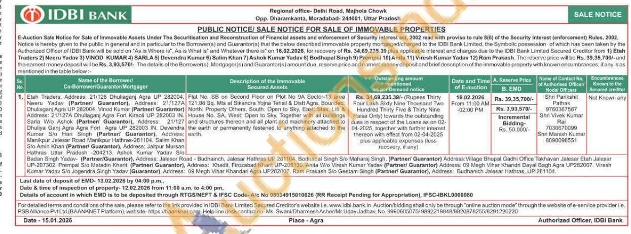 Flat No. SB on Second Floor on Plot No 9A Sector-13 area 121.88 Sq. Mts at Sikandra Yojna Tehsil & Distt Agra. Bounded: North: Property Others, South: Open to Sky, East: Stair, Lift & House No. SA, West: Open to Sky Together with all buildings and structures thereon and all plant and machinery attached to the earth or permanently fastened to anything attached to the earth.