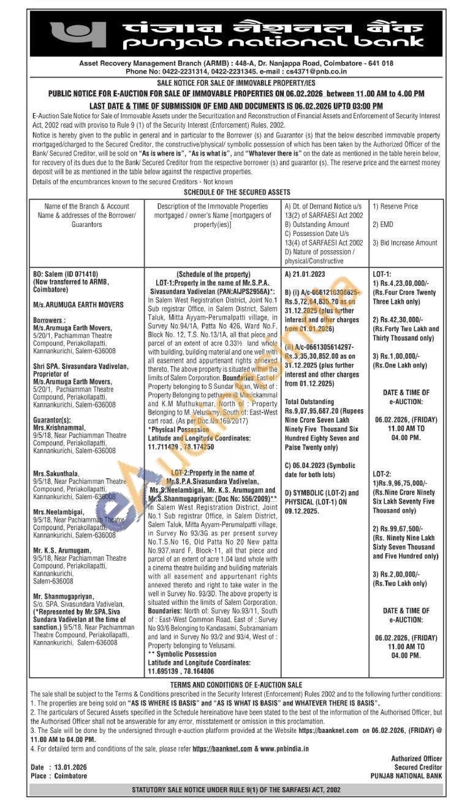 In Salem West Registration District, Joint No.1 Sub registrar Office, in Salem District, Salem Taluk, Mitta Ayyam-Perumalpatti village, in Survey No 93/3G as per present survey No.T.S.No 16, Old Patta No 20 New patta No.937,ward F, Block-11, all that piece and parcel of an extent of acre 1.04 land whole with a cinema theatre building and building materials with all easement and appurtenant rights annexed thereto and right to take water in the well in Survey No. 93/3D. The above property is situated within the limits of Salem Corporation. Boundaries: North of: Survey No.93/11, South of East-West Common Road, East of: Survey No 93/6 Belonging to Kandasami, Subramaniam and land in Survey No 93/2 and 93/4, West of: Property belonging to Velusami.