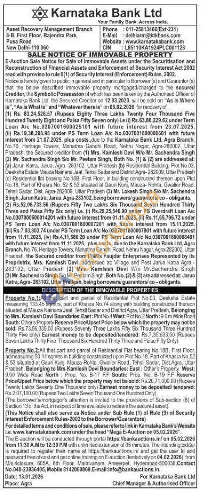All that part and parcel of Residential Flat bearing No. 18B, First Floor, admeasuring 50.14 sqmtrs in building constructed upon Plot No. 18, Part of Khasra No.52 & 53 situated at Gauri Kunj, Mauza-Rohta, Gwalior Road, Tehsil Sadar, Dist. Agra, Uttar Pradesh, Belonging to Mrs. Kamlesh Devi Boundaries: East: Other's Property West: 9.00 Wide Road North Prop. No. B-17 FF South: Prop. No. B-19 F.F