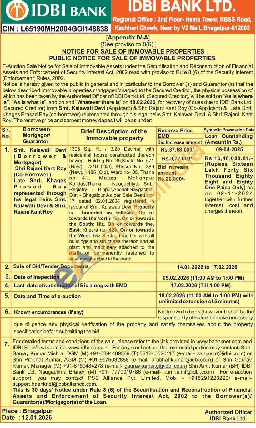 1395 Sq. Ft. 3.20 Decimal with residential house constructed thereon having Holding No. 35, Khata No. 571 (New) 210 (Old). Khesra No. 389 (New)/ 1485 (Old), Ward no-05, Thana no- 41. Mauza Mohanpur Kalidas, Thana Naugachiya, Sub-Registry Bihpur, Anchal-Navgachia. Dist - Bhagalpur As per Sale Deed no-17 dated 02.01.2004 registered in favour of Smt. Kalawati Devi, Property is bounded as follows:On or towards the North: Niz, On or towards the South: Niz, On or towards the, East: Khesra no- 423, On or towards the West: Niz Rasta, Together with all buildings and structures thereon and all plant and machinery attached to the earth or permanently fastened to anything attached to the earth.