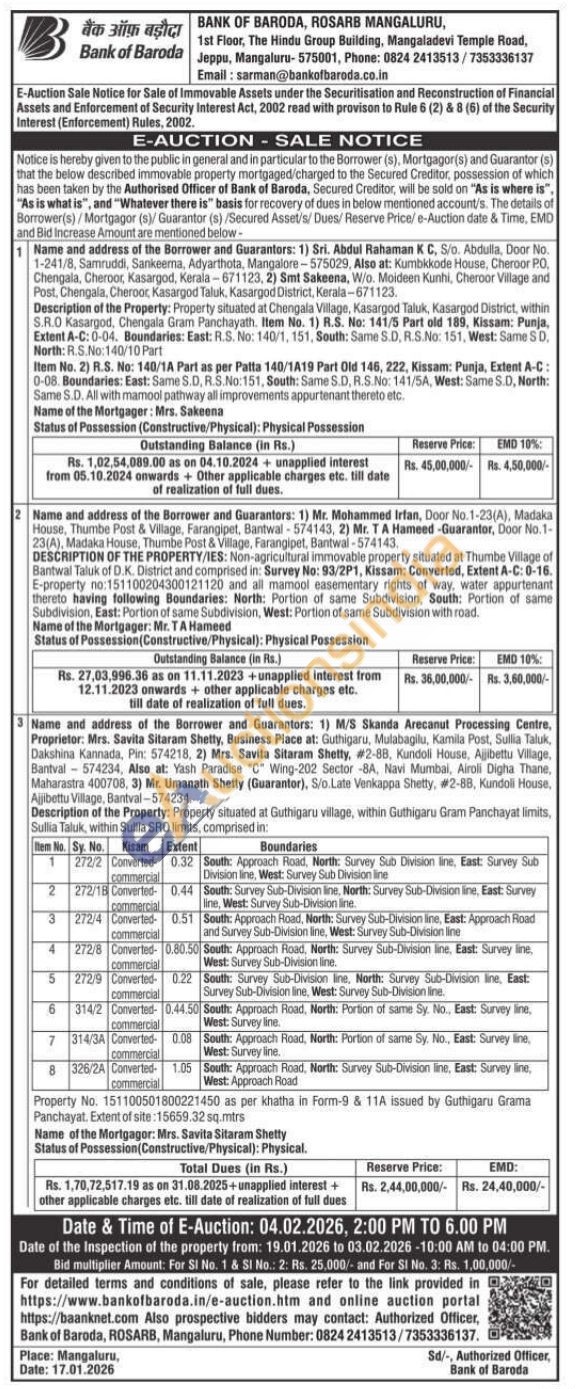 Description of the Property: Property situated at Chengala Village, Kasargod Taluk, Kasargod District, within S.R.O Kasargod, Chengala Gram Panchayath. Item No. 1) R.S. No: 141/5 Part old 189, Kissam: Punja, Extent A-C:0-04. Boundaries: East: R.S. No: 140/1, 151, South: Same S.D. R.S.No: 151, West: Same SD. North: R.S.No 140/10 Part Item No. 2) R.S. No: 140/1A Part as per Patta 140/1A19 Part Old 146, 222, Kissam: Punja, Extent A-C: 0-08. Boundaries: East: Same S.D. R.S.No:151, South: Same S.D, R.S.No: 141/5A, West: Same S.D, North: Same S.D. All with mamool pathway all improvements appurtenant thereto etc.