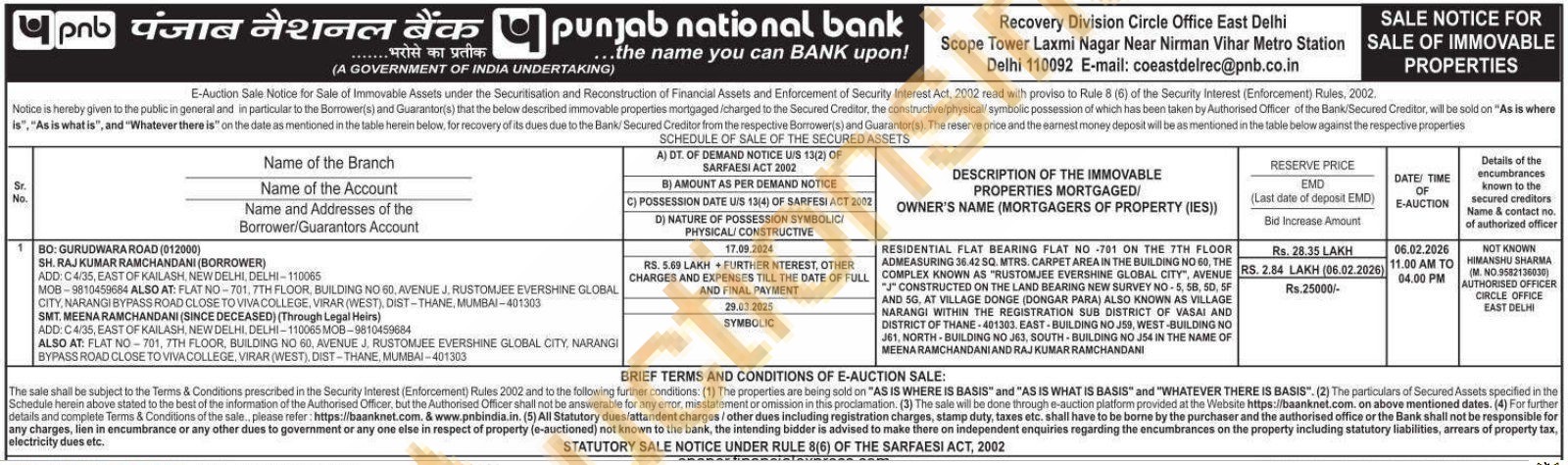 RESIDENTIAL FLAT BEARING FLAT NO -701 ON THE 7TH FLOOR ADMEASURING 36.42 SQ. MTRS. CARPET AREA IN THE BUILDING NO 60, THE COMPLEX KNOWN AS "RUSTOMJEE EVERSHINE GLOBAL CITY", AVENUE "J" CONSTRUCTED ON THE LAND BEARING NEW SURVEY NO-5, 5B, 5D, 5F AND 5G, AT VILLAGE DONGE (DONGAR PARA) ALSO KNOWN AS VILLAGE NARANGI WITHIN THE REGISTRATION SUB DISTRICT OF VASAI AND DISTRICT OF THANE-401303. EAST-BUILDING NO J59, WEST-BUILDING NO J61, NORTH-BUILDING NO J63, SOUTH-BUILDING NO J54 IN THE NAME OF MEENA RAMCHANDANI AND RAJ KUMAR RAMCHANDANI