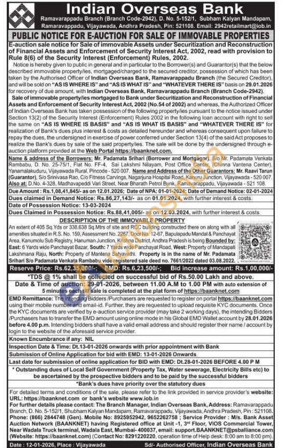 An extent of 405 Sq. Yds or 338.638 Sq.Mtrs of site and RCC building constructed there on along with all amenities situated in R.S. No. 159, Assessment No. 2267, Door No. 12-67, Bapulapadu Mandal & Panchayat Area, Kanumolu Sub Registry, Hanuman Junction, Krishna District, Andhra Pradesh is being Bounded by: East: 6 Yards wide Panchayat Bazar, South: 7 Yards wide Panchayat Road, West: Property of Mandapati Lakshmana Raju, North: Property of Mantena Satyavathi. Property is in the name of Mr. Padamata Srihari S/o Padamata Venkata Rambabu vide registered sale deed no. 7661/2022 dated 03.08.2022