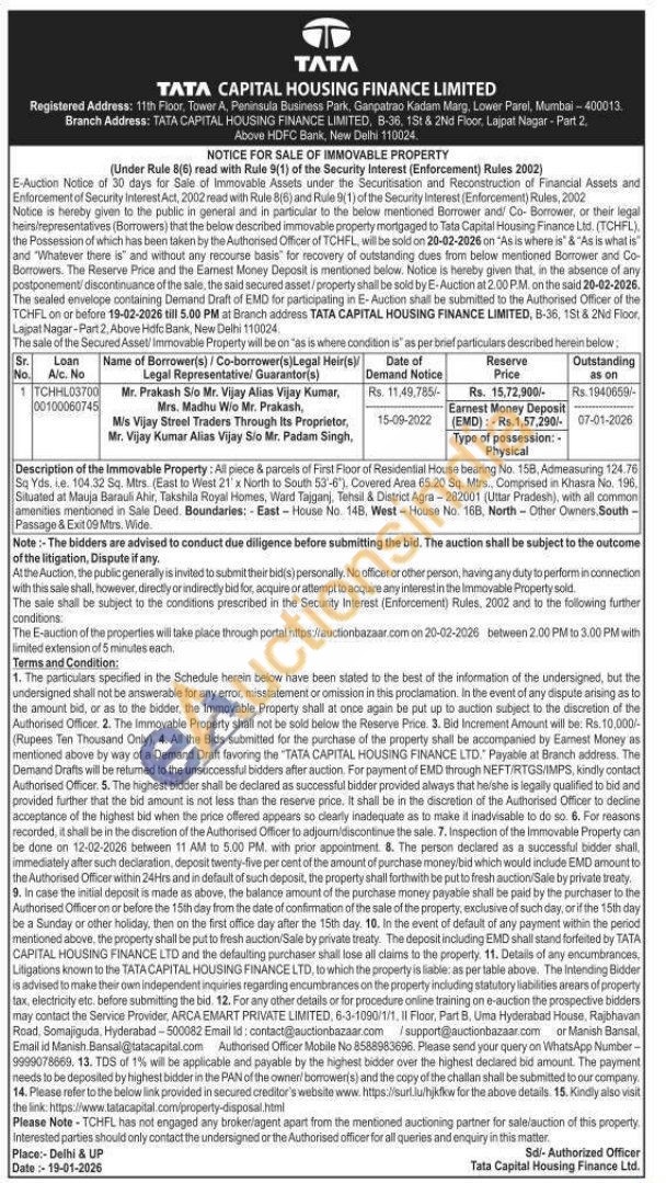 Description of the Immovable Property: All piece & parcels of First Floor of Residential House bearing No. 158, Admeasuring 124.76 Sq Yds, le. 104.32 Sq. Mtrs. (East to West 21' x North to South 53'-6'), Covered Area 65.20 Sq. Mirs., Comprised in Khasra No. 196, Situated at Mauja Barauli Ahir, Takshila Royal Homes, Ward Tajganj, Tehsil & District Agra-282001 (Uttar Pradesh), with all common amenities mentioned in Sale Deed. Boundaries: East-House No. 148, West-House No. 168. North-Other Owners South-Passage & Exit 09 Mtrs. Wide