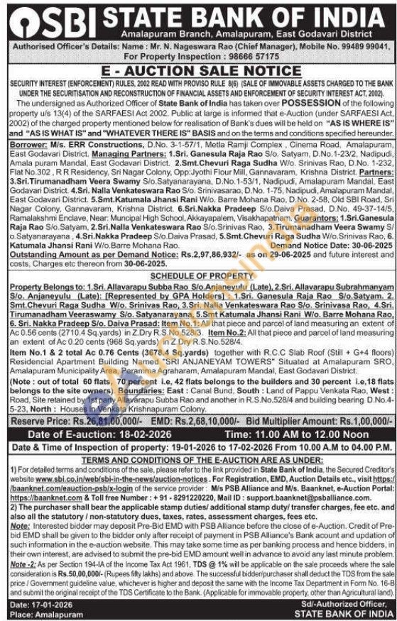 Item No.1: All that piece and parcel of land measuring an extent of Ac 0.56 cents (2710.4 Sq yards) in Z Dry R. S.No.528/3. Item No.2: All that piece and parcel of land measuring an extent of Ac 0.20 cents (968 Sq.yards) in Z.Dry R.S.No. 528/4 Item No.1 & 2 total Ac 0.76 Cents (3678.4 Sq.yards) together with R.C.C Slab Roof (Stilli+G+4 floors) Residencial Apartment Building Named "SRI ANJANEYAM TOWERS" Situated at Amalapuram SRO, Amalapuram Municipality Area, Peramma Agraharam, Amalapuram Mandal, East Godavari District. (Note: out of total 60 flats, 70 percent i.e, 42 flats belongs to the builders and 30 percent i.e, 18 flats belongs to the site owners). Boundaries: East: Canal Bund, South: Land of Pappu Venkata Rao, West: Road, Site retained by 1st party Allavarapu Subba Rao and another in R.S.No.528/4 and building bearing D.No.4-5-23, North: Houses in Venkata Krishnapuram Colony.