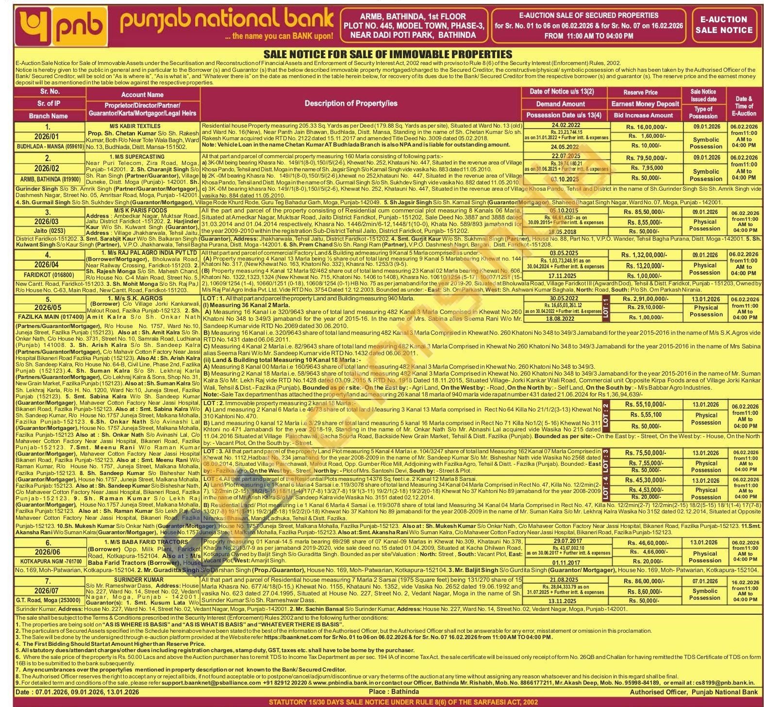 All that part and parcel of commercial property measuring 180 Marla consisting of following parts 24.05.2022 22.07.2025 Rs. 79,50,000/- Symbolic Possession a) 3K-OM being bearing Khasra No. 149//1(8-0),150//5/(2-6), Khewat No. 252, Khatauni No. 447, Situated in the revenue area of Village o Khosa Pando, Tehsil and Distt. Moga in the name of Sh. Jagsir Singh Sio Karnail Singh vide vasika No. 883 eb) 2K-OM bearing Khasra No. 149//1(8-0),150//5/(2-6),khewat no 252, khatauni No. 447, Situated in the revenue area of Village 1.Khosa Pando, Tehsiland Distt. Moga in the name of Sh. Gurmail Singh S/o Sh. Sukhdev Singh vide vasika No. 882 dated 11.05.2010. 1. c) 3K -OM bearing khasra No. 149//1(8-0),150//5/(2-6), Khewat No. 252, Khatauni No. 447, Situated in the revenue area of Village