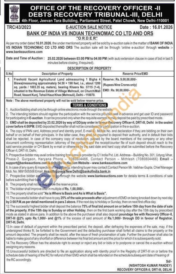 Freehold Vacant Agricultural Land admeasuring 1 Bigha 4 Biswa(measuring approximately 54.50 198 feet, i.e., about 1200 sq. yards/1003.35 sq. meters), bearing Khasra No. 37/15 (1-4), situated in the Revenue Estate of Village Mehrauli, on Church/Mall Road, Vasant Kunj. Tehsil Hauz Khas (Mehrauli), Delhi-110070.