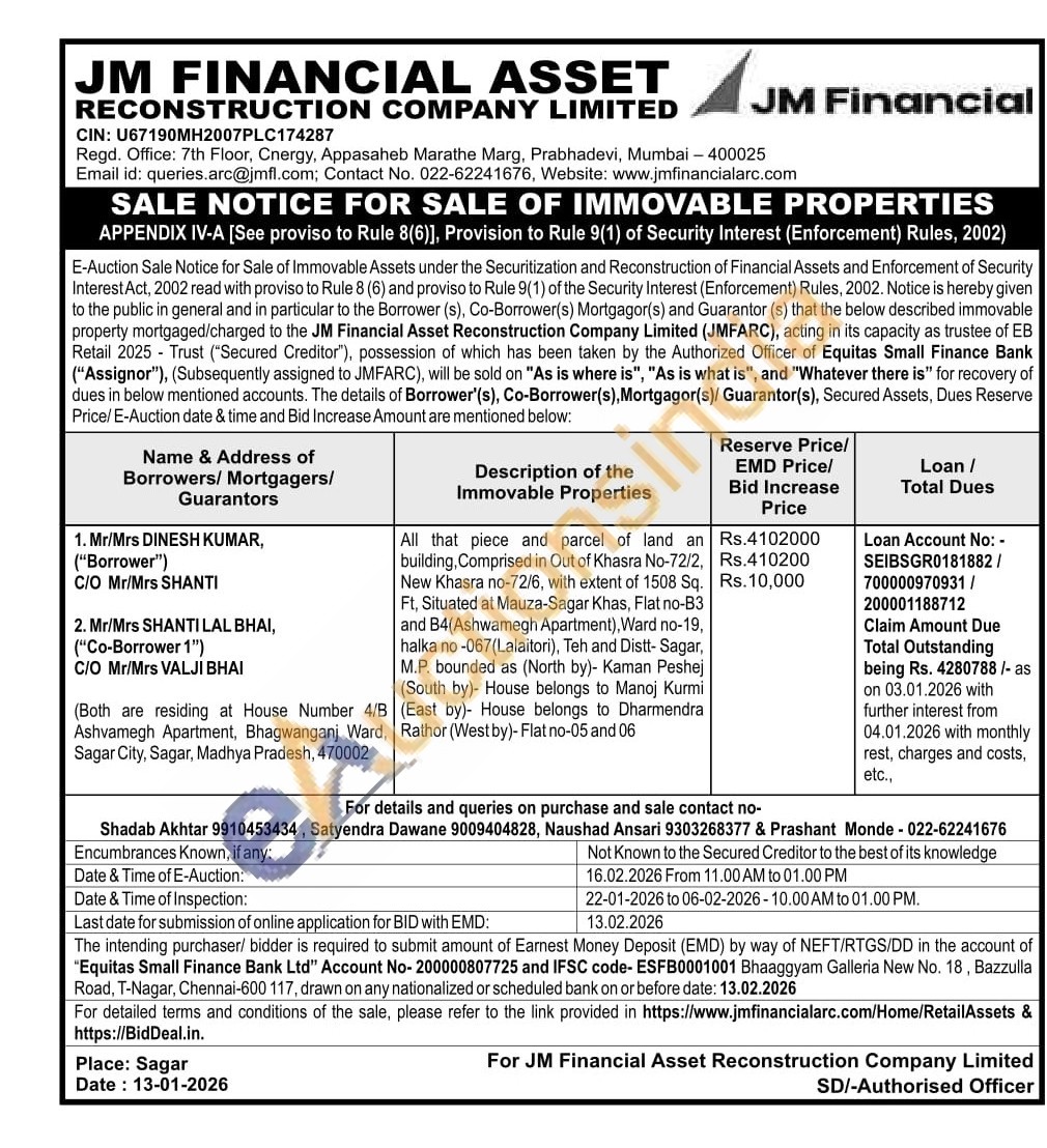 All that piece and parcel of land an building, Comprised in Out of Khasra No-72/2, New Khasra no-72/6, with extent of 1508 Sq. Ft, Situated at Mauza-Sagar Khas, Flat no-B3 and B4(Ashwamegh Apartment), Ward no-19, halka no-067(Lalaitori), Teh and Distt- Sagar, M.P. bounded as (North by)- Kaman Peshej (South by)- House belongs to Manoj Kurmi (East by)- House belongs to Dharmendra Rathor (West by)-Flat no-05 and 06