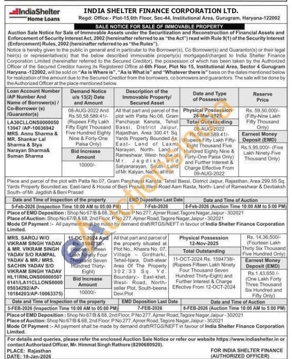 All that part and parcel of the plot with Patta No.08, Gram Panchayat Kanota, Tehsil Bassi. District Jaipur. Rajasthan, Area 300.41 Sq Yards Property Bounded As: East-Land of Laxmi Narayan, North Land of Rameshwar, West- house of Mr. Jagdish and Satyanarayan, South- Land of Mr. Kalyan, Nathu all that Piece and parcel of the plot with Patta No.07, Gram Panchayat Kanota, Tehsil Bassi, District Jaipur, Rajasthan, Area 299.55 Sq. Yards Property Bounded as: East-land & House of Beni Prasad West-Road Aam Rasta, North-Land of Rameshwar & Devbaksh South-of Mr. Jagdish & Beni Prasad