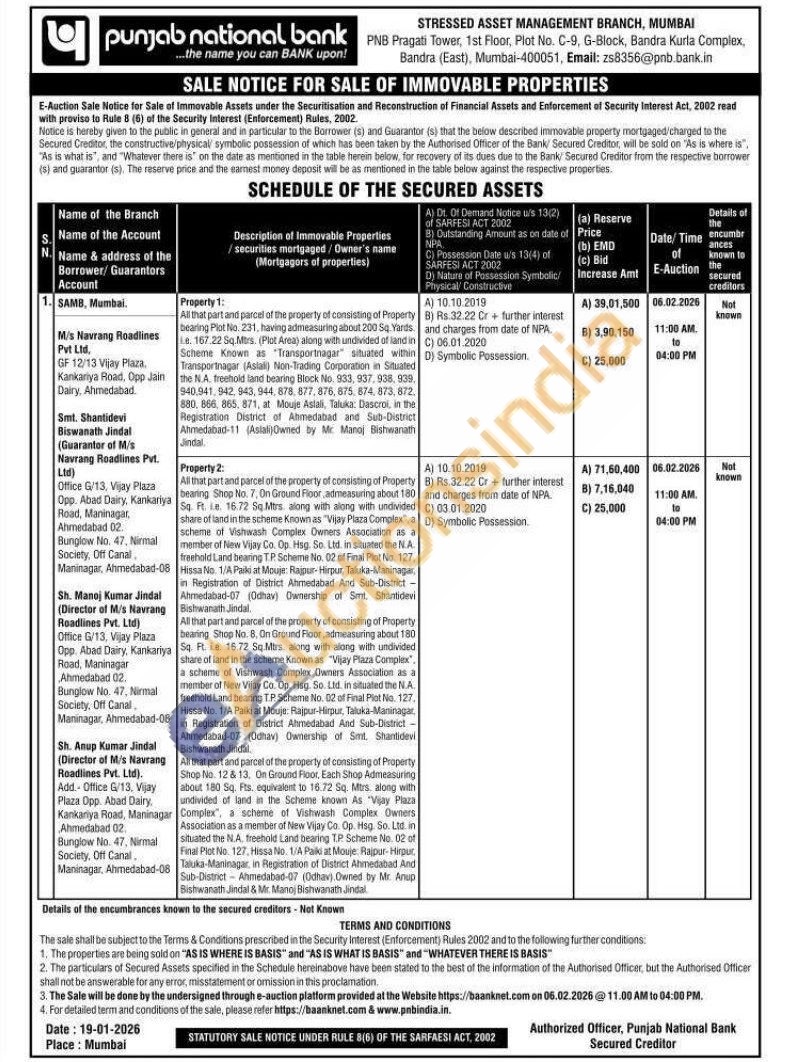 All that part and parcel of the property of consisting of Property bearing Shop No. 7. On Ground Floor admeasuring about t80 Sq. Ft. e. 16.72 Sq.Mtrs along with along with undivided share of land in the scheme Known as "Vijay Plaza Complex, a scheme of Vishwash Complex Owners Association as a member of New Vijay Co. Op. Hsg. So. Ltd. in situated the N.A. freehold Land bearing TP. Scheme No. 02 of Final Plot No. 127, Hissa No. 1/A Paiki at Mouje: Ragpur-Hirpur, Taluka-Maninagar, in Registration of District Ahmedabad And Sub-District -Ahmedabad-07 (Odhav) Ownership of Smt. Shantidni Bishwanath Jindal All that part and parcel of the property of consisting of Property bearing Shop No. 8. On Ground Floor, admeasuring about 180 Sq. R. in. 16.72 Sq.Mtrs. along with along with undivided share of land in the scheme Known as "Vijay Plaza Complex", a scheme of Vishwash Complex Owners Association as a member of New Vijay Co. Op. Hsg. So. Ltd. in situated the N.A. freehold Land bearing TP Scheme No. 02 of Final Plot No. 127. Hissa No. 1/A Paiki at Mouje: Rajpur-Hirpur, Taluka-Maninagar in Registration of District Ahmedabad And Sub-District -Ahmedabad-07 (Odhav) Ownership of Smit. Shantidevi Bishwanath Jindal All that part and parcel of the property of consisting of Property Shop No. 128 13. On Ground Floor, Each Shop Admeasuring about 180 Sq. Fts. equivalent to 16.72 Sq. Mtis, along with undivided of land in the Scheme known As "Vijay Plaza Complex, a scheme of Vishwash Complex Owners Association as a member of New Vijay Co. Op. Hsg. So. Ltd. in situated the N.A. treehold Land bearing T.P Scheme No. 02 of Final Plot No. 127. Hissa No. 1/A Paiki at Mouje. Rajpur Hirpur Tauka-Maninagar in Registration of District Ahmedabad And Sub-District Ahmedabad-07 (Odhav) Owned by Mr. Anup Bishwanath Jindal & Mr. Manoj Bishwanath Jindal