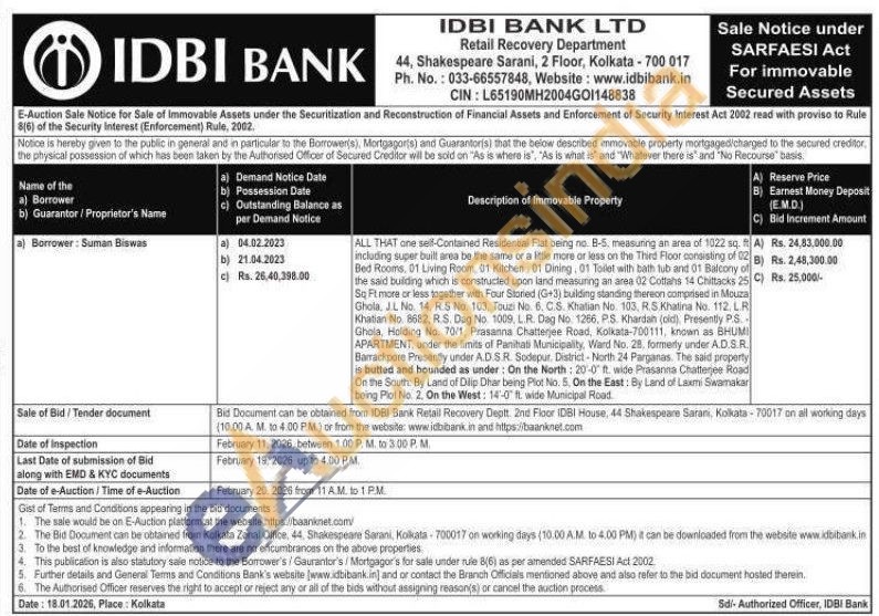 ALL THAT one sell-Contained Residential Flat being no B-5, measuring an area of 1022 sq. including super built area be the same or a little more or less on the Third Floor consisting of 12 Bed Rooms, 01 Living Room, 01 Kitchen, 01 Dining, 01 Tollet with bath tub and 01 Balcony of the said buliding which is constructed upon land measuring an area 02 Cottahs 14 Chittacks 25 Sq Ft more or less together with Four Storied (G+3) building standing thereon composed in Mouza Ghola, JL No. 14, R.S No. 103, Touzi No. 6. C.S. Khatian No. 103, R.S.Khatina No. 112. L.R Khatian No. 8682, R.S. Dag No. 1009, L.R. Dag No. 1266, P.S. Khardan (old). Presently PS. Ghola, Holding No. 70/1 Prasanna Chatterjee Road, Kolkata-700111, known as BHUMI APARTMENT, under the limits of Panihati Municipality, Ward No. 28. formerly under A.D.SR. Barrackpore Presently under A.D.S.R. Sodepur District-North 24 Parganas. The said property is butted and bounded as under: On the North: 20-0 ft wide Prasanna Chatterjee Road On the South By Land of Dilip Dhar being Plot No. 5. On the East: By Land of Laxmi Swamakar being Plat No. 2. On the West: 14-0 fL wide Municipal Road