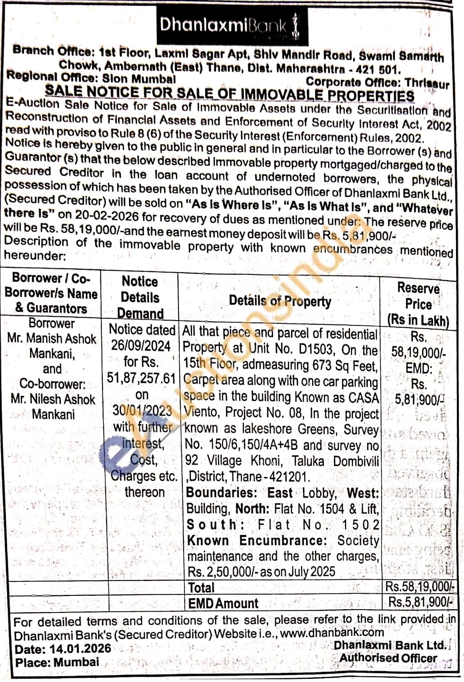 Boundaries: East Lobby, West: Building, North: Flat No. 1504 & Lift, South: Flat No. 1502 Known Encumbrance: Society maintenance and the other charges, Rs. 2,50,000/-as on July 2025