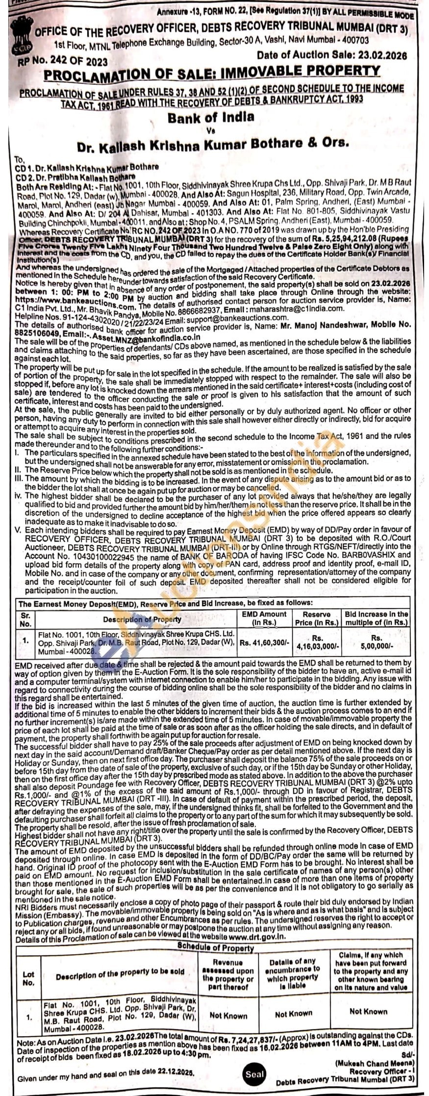 Authorised Officer Mr. Manoj Nandeshwar Mobile No: 8825106049