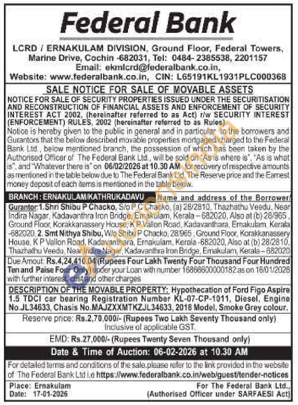 DESCRIPTION OF THE MOVABLE PROPERTY: Hypothecation of Ford Figo Aspire 1.5 TDCI car bearing Registration Number KL-07-CP-1011, Diesel, Engine No.JL34633, Chasis No.MAJZXXMTKZJL34633, 2018 Model, Smoke Grey colour