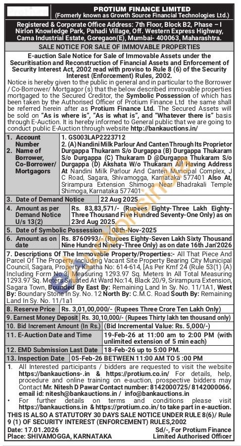 Descriptions Of The Immovable Property/Properties:- All That Piece And Parcel Of The Property Including Vacant Site Property Bearing City Municipal Council, Sagara, Property Khatha No: 614-614, [As Per Kmf 24 (Rule 53(1) (A) Including Form No.3] Measuring 1293.97 Sq. Meters In All Total Measuring 1293.97 Sq. Meters Situated At Ward No:14, Black 20/9, Srirampura Extension, Sagara Town, Bounded By East By: Remaining Land In Sy. No. 11/1A1, West By: Boundary Stone In Sy. No. 12 North By: C.M.C. Road South By: Remaining Land In Sy. No. 11/1a1
