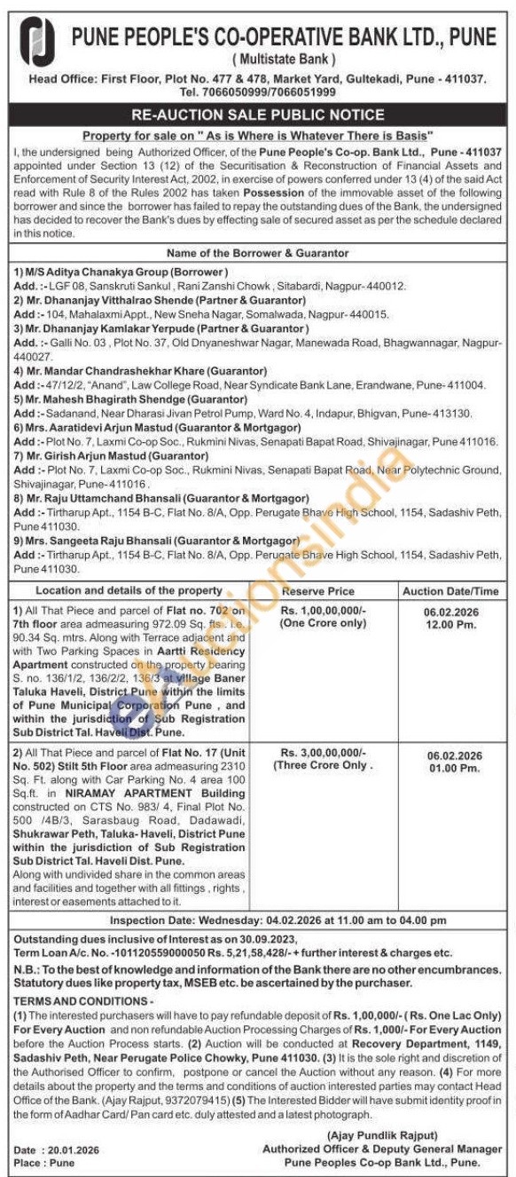 2) All That Piece and parcel of Flat No. 17 (Unit No. 502) Stilt 5th Floor area admeasuring 2310 Sq. Ft. along with Car Parking No. 4 area 100 Sq.ft. in NIRAMAY APARTMENT Building constructed on CTS No. 983/4, Final Plot No. 500 /48/3, Sarasbaug Road, Dadawadi, Shukrawar Peth, Taluka-Haveli, District Pune within the jurisdiction of Sub Registration Sub District Tal. Haveli Dist. Pune.