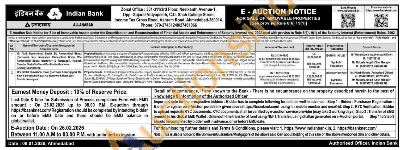 Property Details: All that piece and parcel of Residential Property situated at Flat No D/703 on 7th Floor admeasuring 83.53 sq.mtrs Carpet area, Balcony & wash Area admeasuring 5.26 Sq. Mtrs totally admeasuring 88.79 Sq. Mirs together with undivided share in the land 34.18 Sq. mirs in the scheme known as "SANIDHYA ROYAL Constructed on freehold Non agricultural land bearing Survey No. No. 284/1, Final Plot No 222 of T.P. Scheme No. 69 (Chandkheda-Zundal-Trgad) of Mouje Targad, Takula Ghatolidia in the District of Ahmedabad Sub Registration at Ahmedabad-8 (Sola) and stand in the name of Mamtaben Rameshbhai Bhatia the said Property is bounded as under: North: Flat No. E/702, South: Flat D/704, East: Garden of Society, West: Flat No. D/702