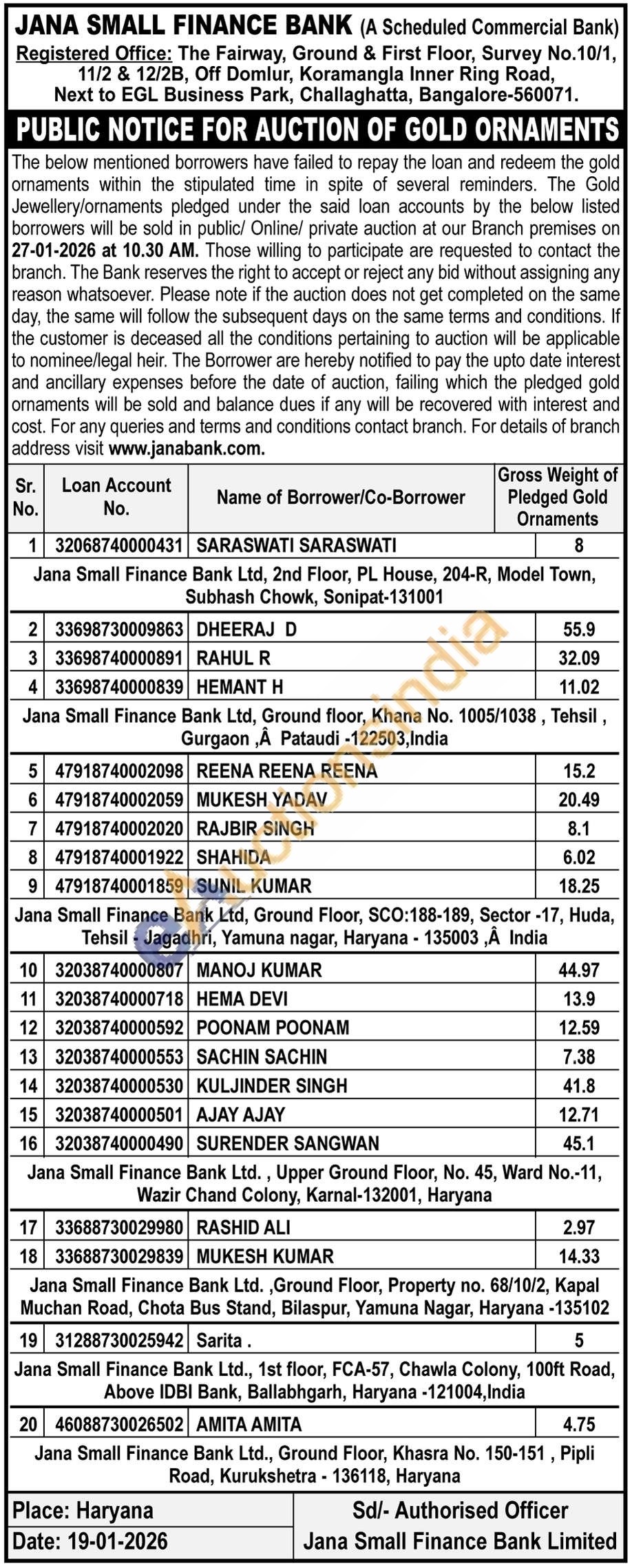 Jana Small Finance Bank Gold Auctions Auction in Sonipat