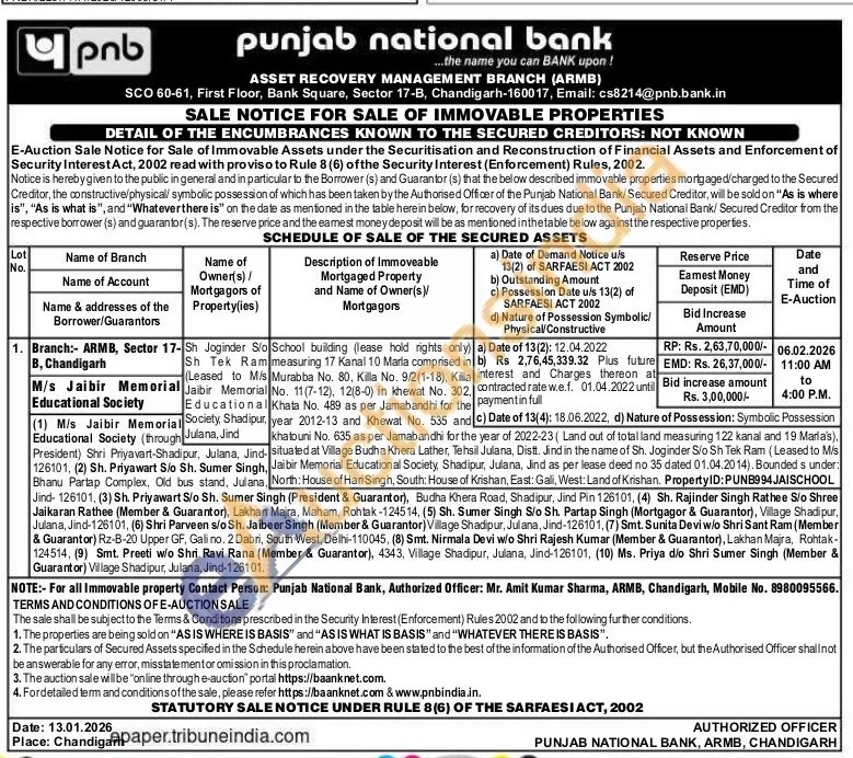 School building (lease hold rights only) measuring 17 Kanal 10 Maria comprised in Murabba No. 80, Killa No. 9/2(1-18), Killa No. 11(7-12), 12(8-0) in khewat No. 302 Khata No. 489 as per Jamabandhi for the year 2012-13 and Khewat No. 535 and whatbuni No. 635 as per Jamabandhi for the year of 2022-23 (Land out of total land measuring 122 kanal and 19 Maria's). situated at Village Budha Khera Lather, Tehsil Julana, Distt. Jind in the name of Sh. Joginder S/o Sh Tek Ram (Leased to Mis Jaibir Memorial Educational Society, Shadipur, Julana, Jind as per lease deed no 35 dated 01.04.2014). Bounded s under North: House of Han Singh, South: House of Krishan, East: Gall, West: Land of Krishan.