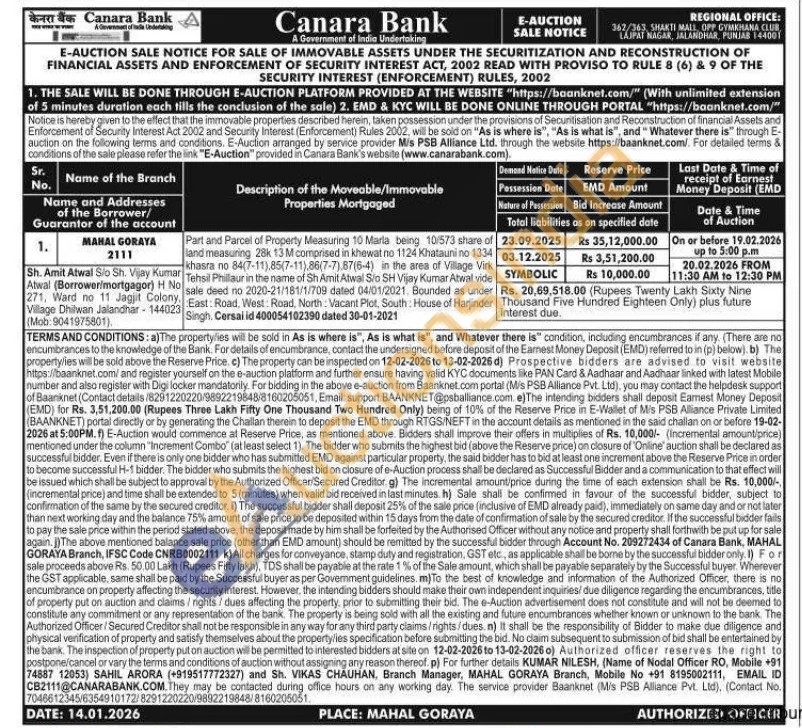 Part and Parcel of Property Measuring 10 Marla being 10/573 share of land measuring 28k 13 M comprised in khewat no 1124 Khatauni no 1334 khasra no 84(7-11),85(7-11),86(7-7).87(6-4) in the area of Village Virk Tehsil Phillaur in the name of Sh Amit Atwal S/c SH Vijay Kumar Atwal vide sale deed no 2020-21/181/1/709 dated 04/01/2021. Bounded as under East Road, West: Road, North: Vacant Plot, South: House of Harjinder Singh. Cersal id 400054102390 dated 30-01-2021